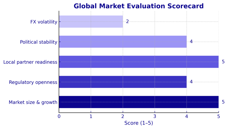 Fintechs expanding internationally should evaluate each target market against consistent, data-driven criteria. A practical market scorecard might include: